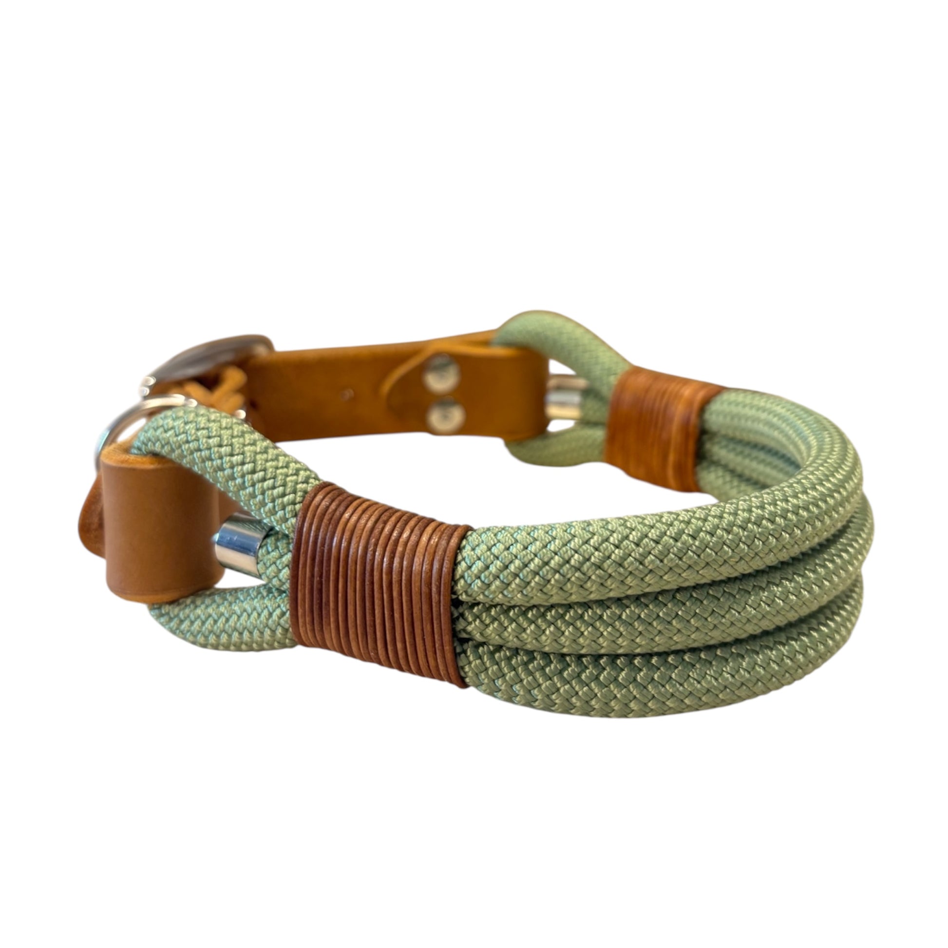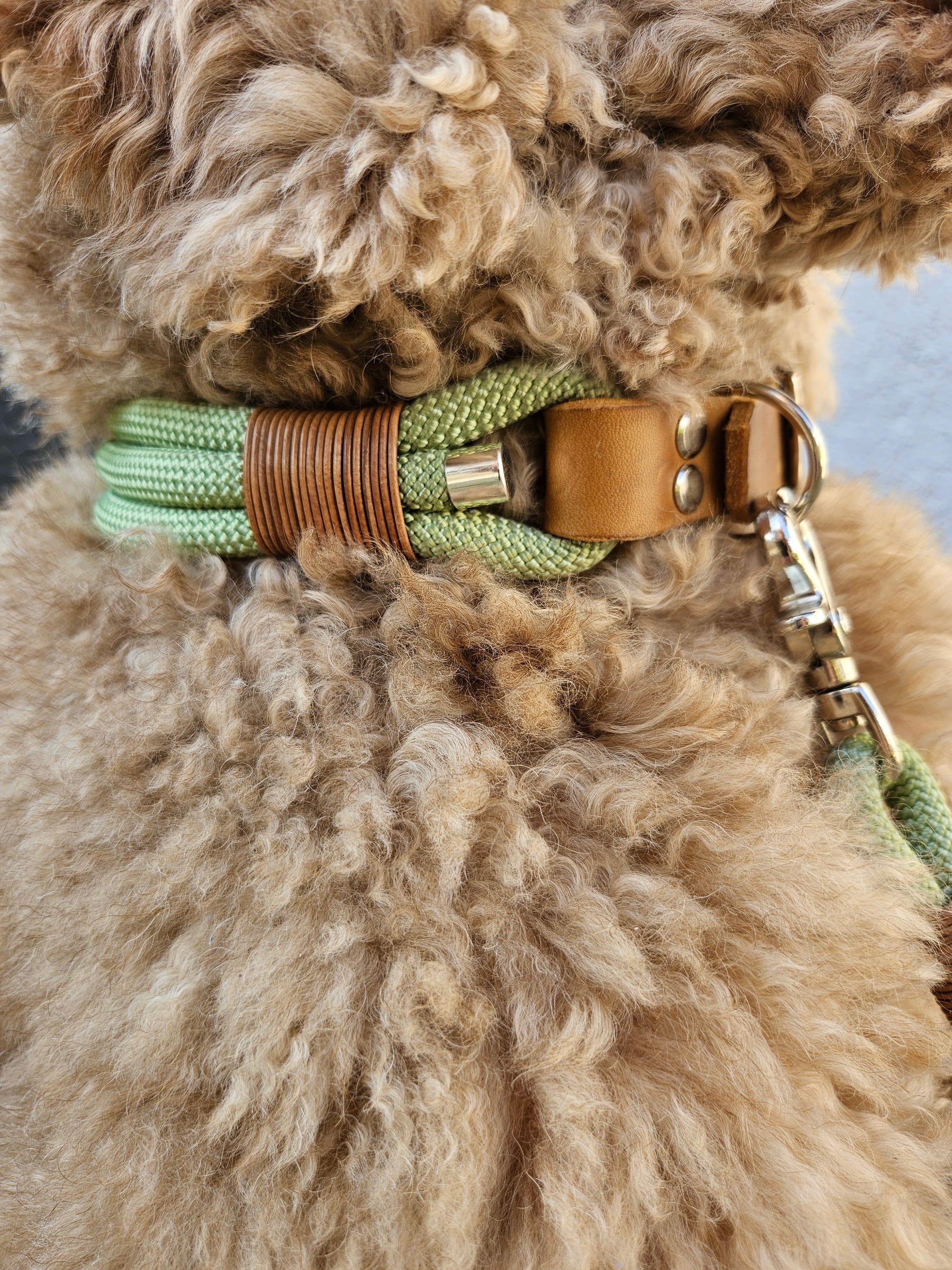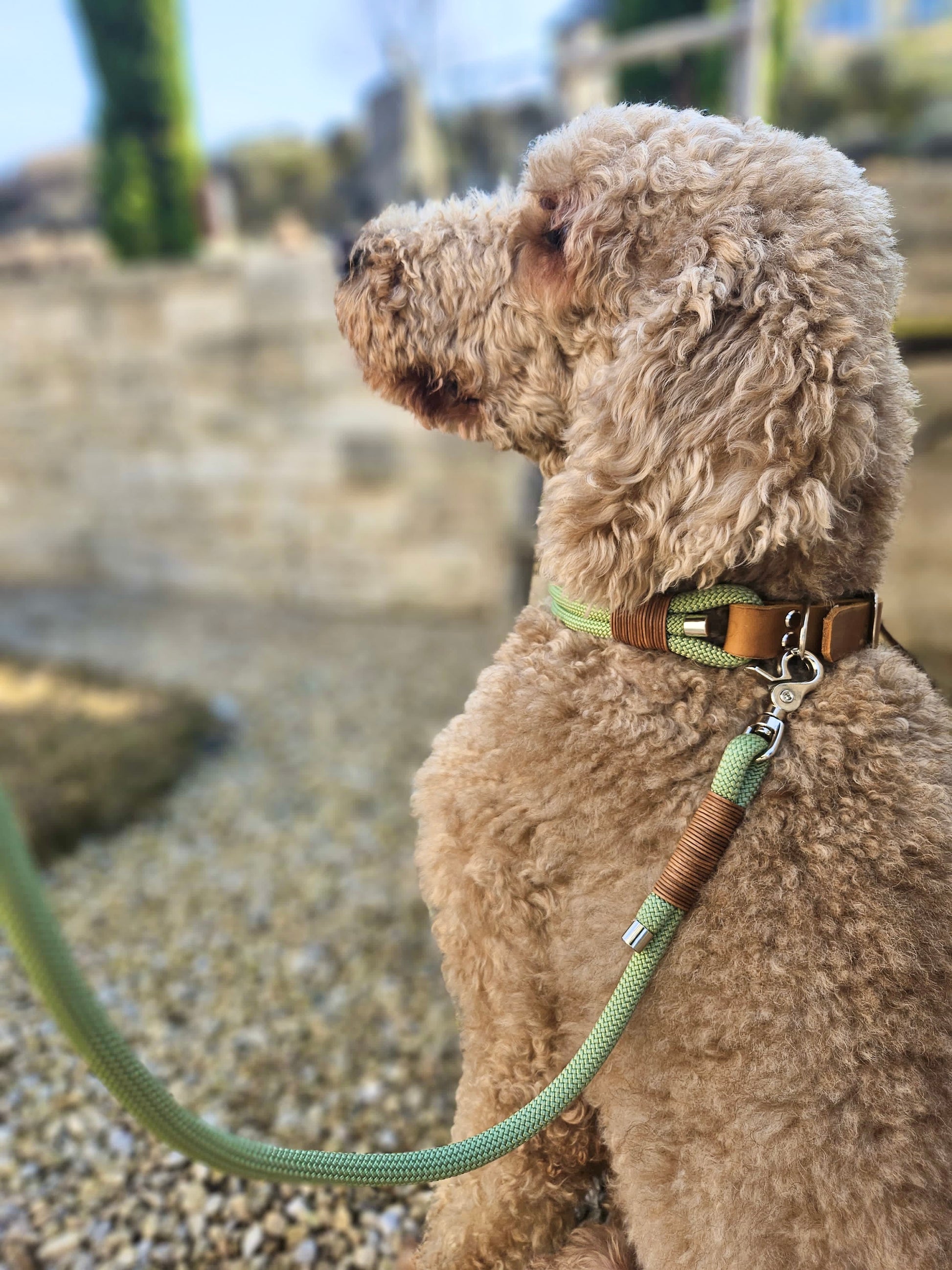 Unser Halsband- und Leinenset 'Elva' in den eleganten Farben Grün & Cognac kombiniert hervorragende Funktionalität mit einem modischen Look. Dieses Set setzt nicht nur optische Akzente, sondern sorgt auch für höchsten Komfort und Sicherheit bei jedem Spaziergang – für deinen Hund und dich.