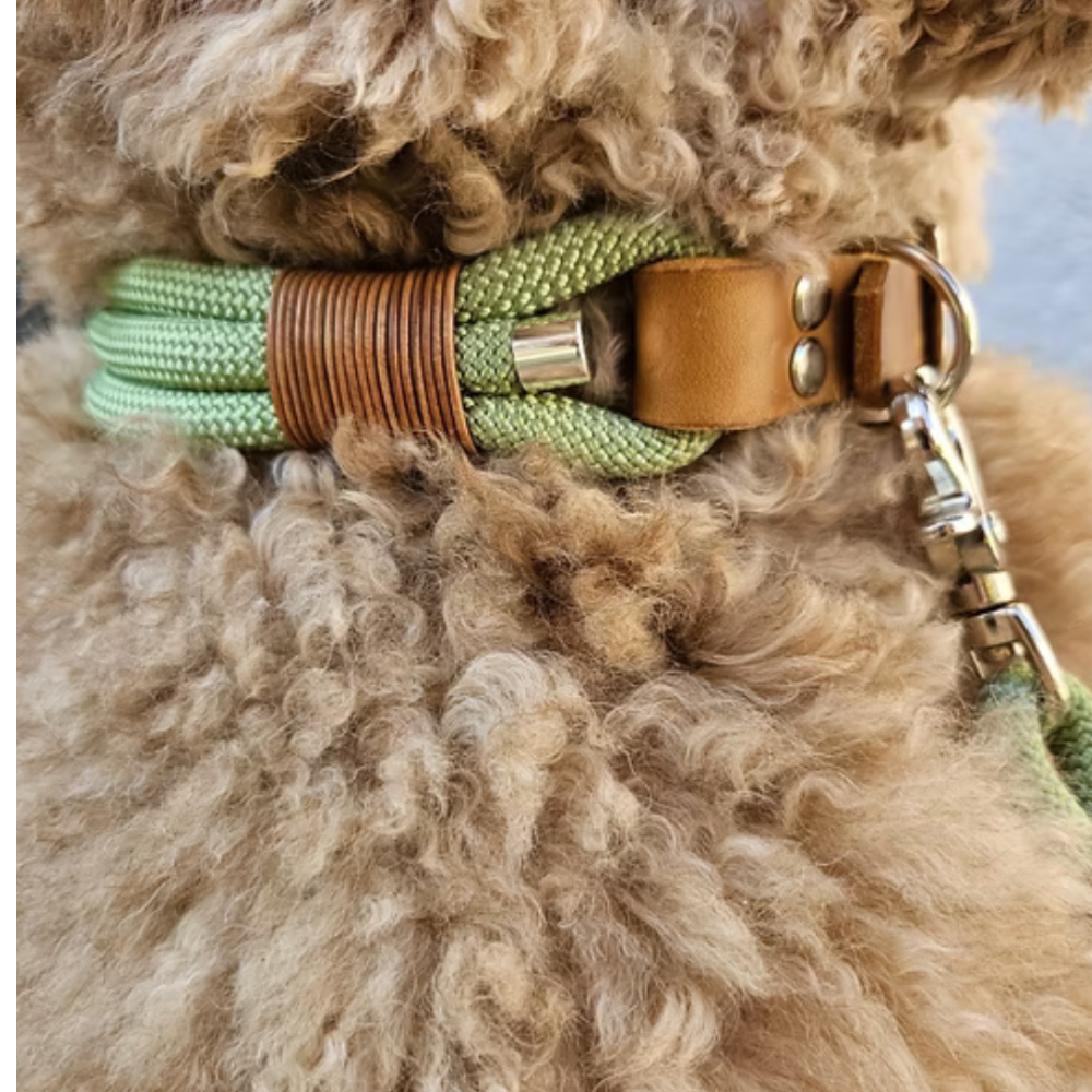 Unser Halsband in der eleganten Kombination aus Tau und hochwertigem Fettleder bietet die perfekte Balance zwischen Funktionalität und modischem Flair. Das wunderschöne grüne Seil in Kombination mit cognacfarbenem Fettleder macht dieses Halsband zu einem echten Hingucker für dich und deinen Hund.