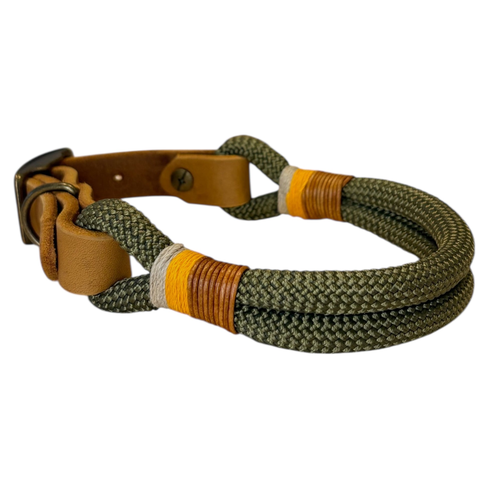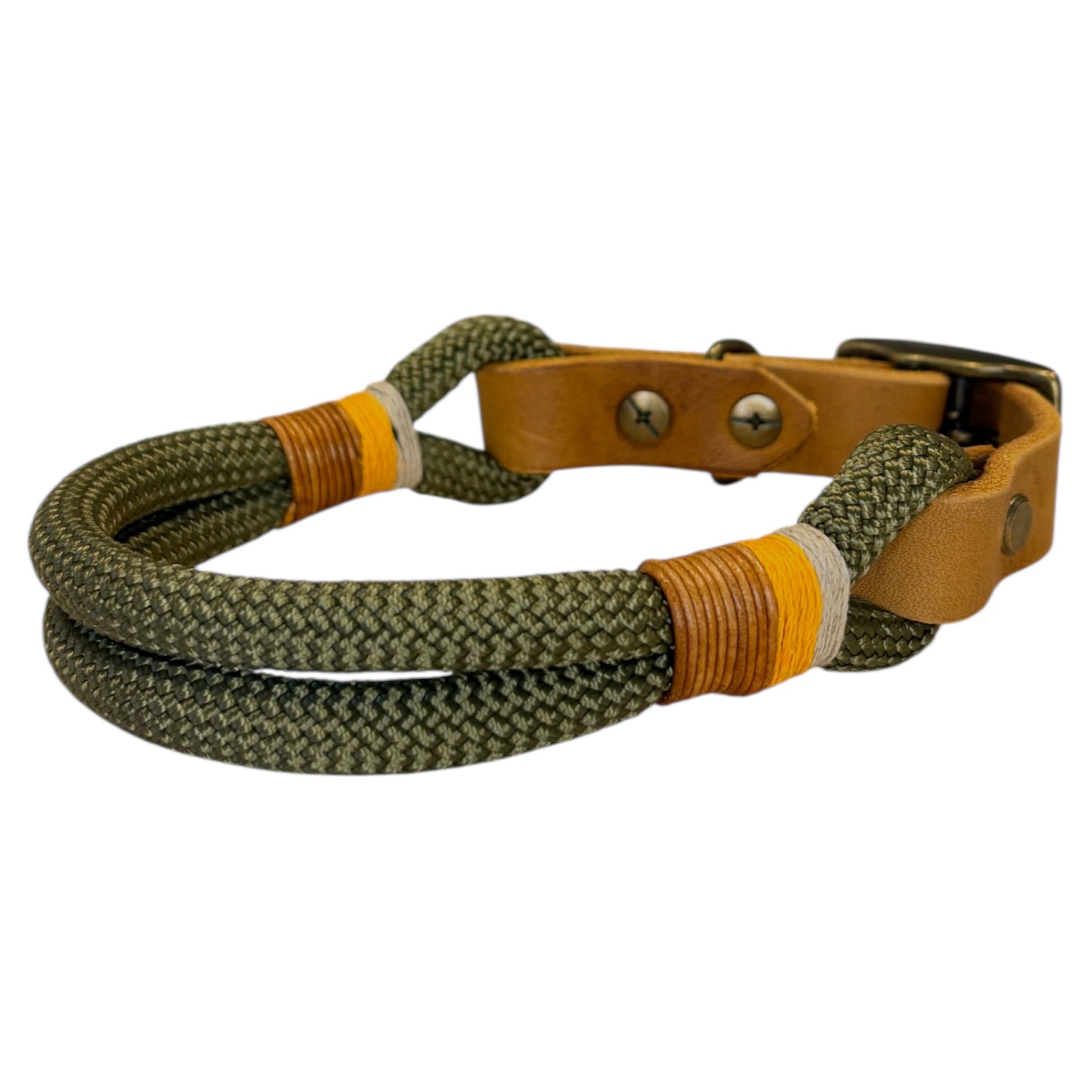 Unser Halsband in der eleganten Kombination aus Tau und hochwertigem Fettleder bietet die perfekte Balance zwischen Funktionalität und modischem Flair. Das wunderschöne grüne Seil in Kombination mit cognac Fettleder macht dieses Halsband zu einem echten Hingucker für dich und deinen Hund.