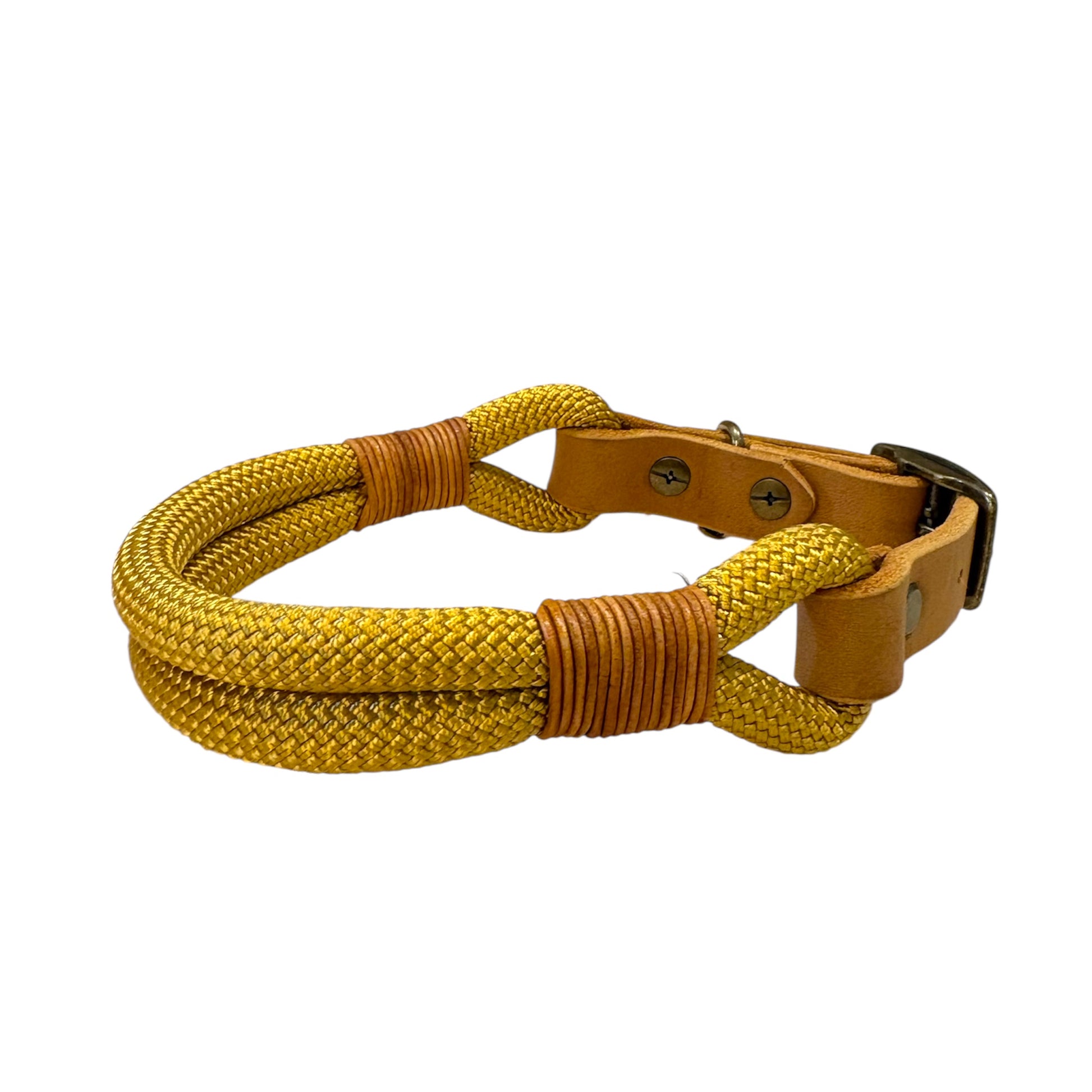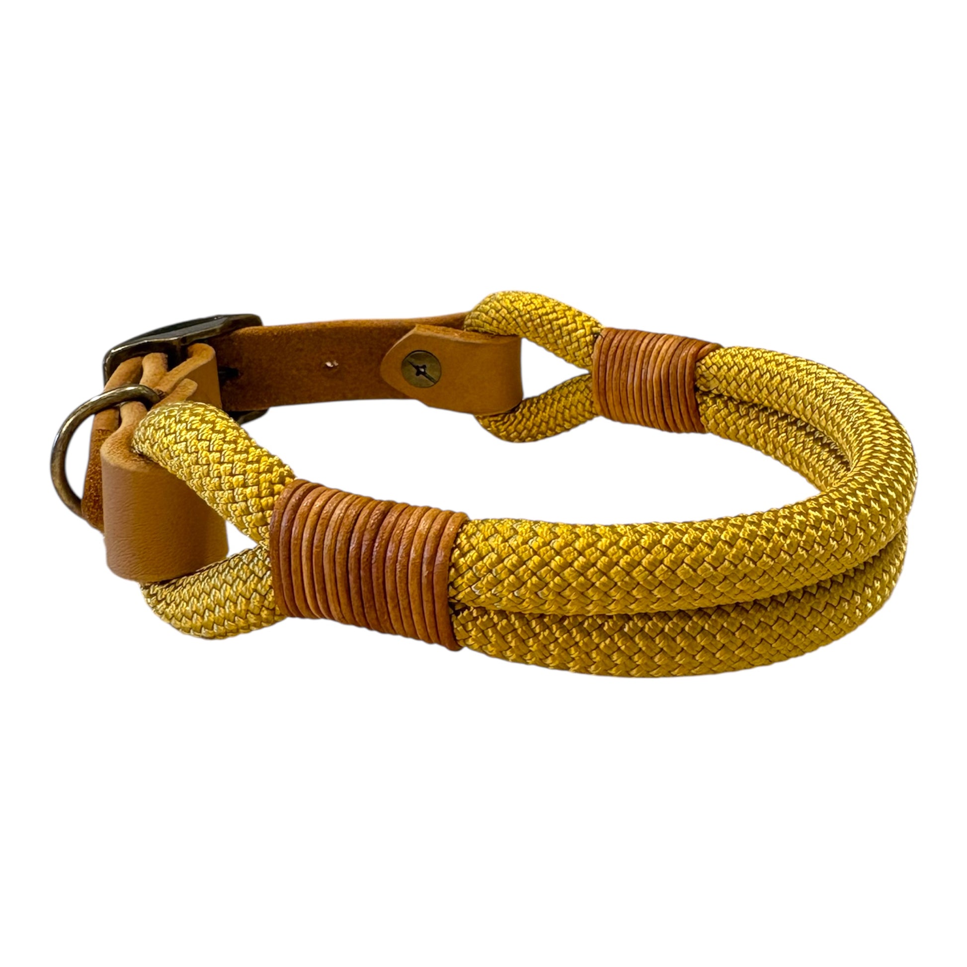 Unser Halsband in der eleganten Kombination aus Tau und hochwertigem Fettleder bietet die perfekte Balance zwischen Funktionalität und modischem Flair. Das wunderschöne goldgelbe Seil in Kombination mit cognac Fettleder macht dieses Halsband zu einem echten Hingucker für dich und deinen Hund.