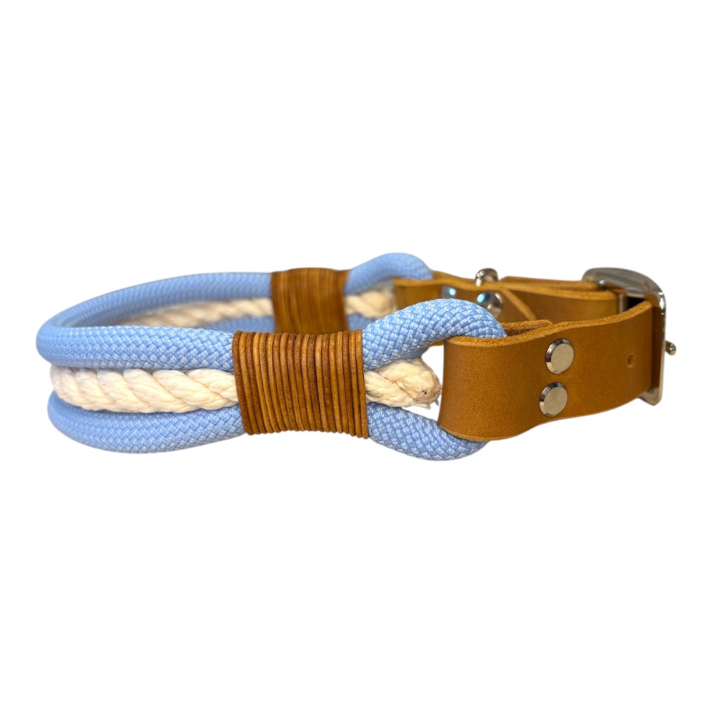 Unser Halsband in der eleganten Kombination aus Tau und hochwertigem Fettleder bietet die perfekte Balance zwischen Funktionalität und modischem Flair. Das wunderschöne blaue & sahne Seil in Kombination mit cognac Fettleder macht dieses Halsband zu einem echten Hingucker für dich und deinen Hund.