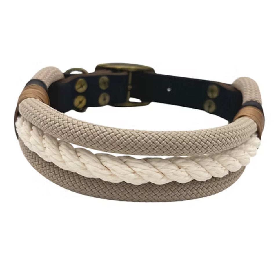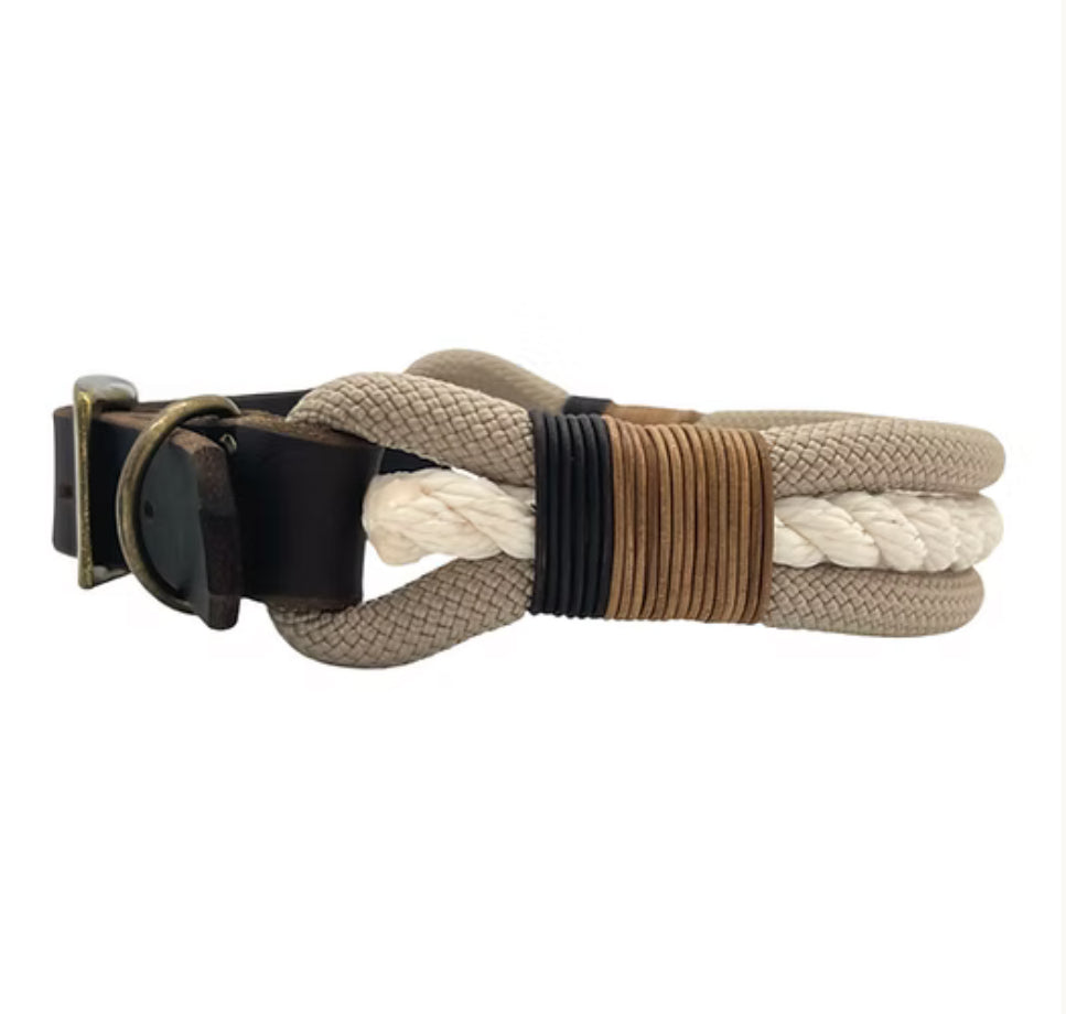Unser Halsband in der eleganten Kombination aus Tau und hochwertigem Fettleder bietet die perfekte Balance zwischen Funktionalität und modischem Flair. Das wunderschöne Mocca & Sahne Seil in Kombination mit schokobraunem Fettleder macht dieses Halsband zu einem echten Hingucker für dich und deinen Hund.