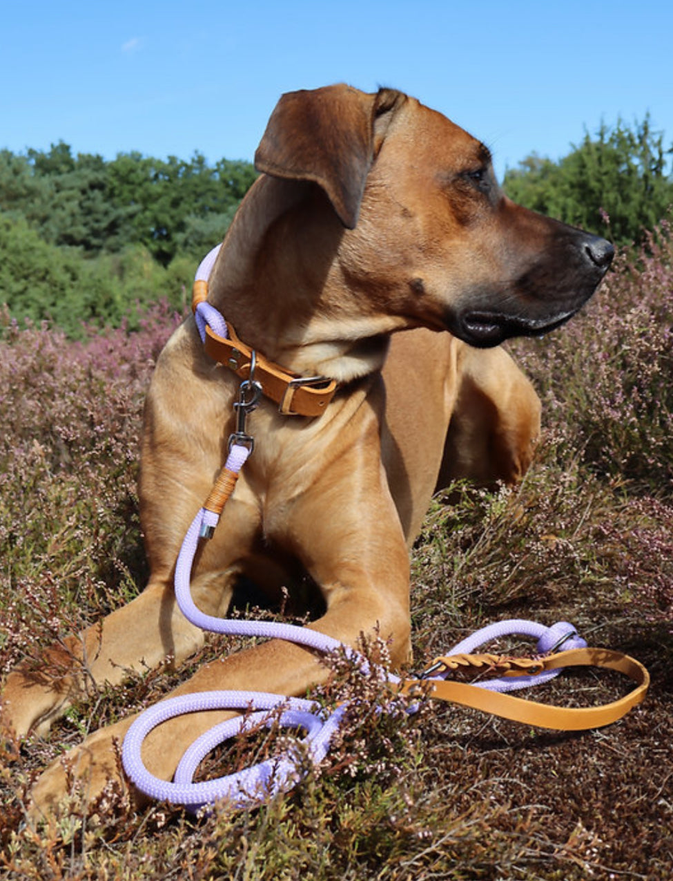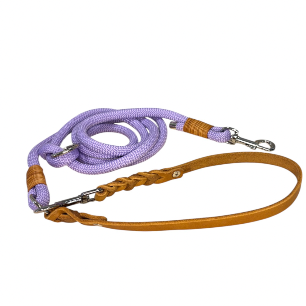 Unsere Kombileine ist die perfekte Mischung aus Stil und Funktionalität – die ideale Wahl für deinen treuen Begleiter. Das wunderschöne lila Seil kombiniert mit hochwertigem cognac-Fettleder sorgt nicht nur für einen modischen Look, sondern auch für Komfort und Sicherheit bei jedem Spaziergang.